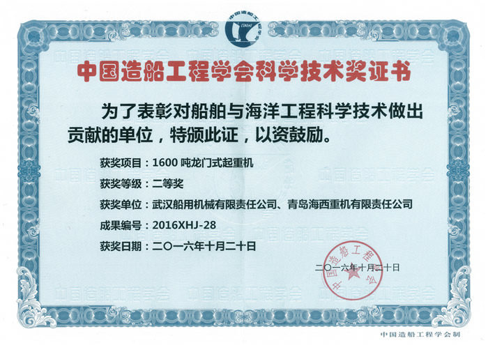近日,中國造船工程學(xué)會傳來喜訊,我司《1600噸龍門式起重機(jī)》榮獲科學(xué)技術(shù)二等獎。這是青島海西重機(jī)在船舶與海洋工程領(lǐng)域獲得的又一項具有較高影響力的榮譽(yù)。