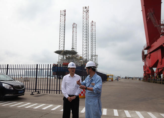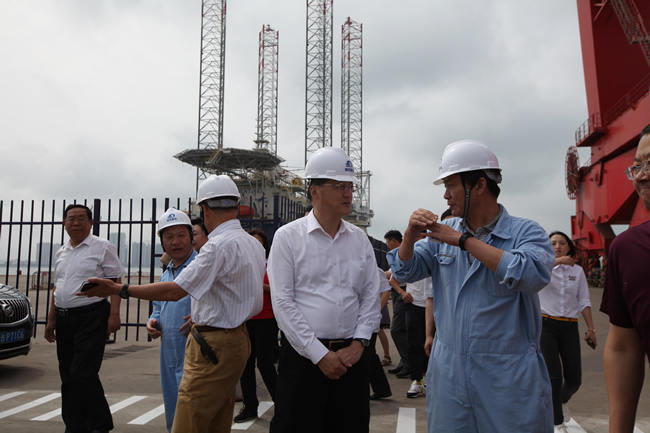 楊軍一行參觀了海西重機港口設備總裝現(xiàn)場,并重點參觀了在建的阿聯(lián)酋110米桁架自升式海工平臺,聽取了海西重機董事長鄧振山對公司目前生產(chǎn)經(jīng)營形勢、生產(chǎn)負荷情況等方面的介紹,對海西重機在國際海工平臺市場上所取得的成績給予了肯定。