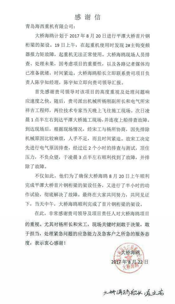 自今年年初設(shè)備交付以來,海西重機(jī)定期安排技術(shù)人員進(jìn)行回訪,協(xié)助業(yè)主方對設(shè)備進(jìn)行檢查和保養(yǎng),及時處理故障,保證設(shè)備高效運(yùn)作,有力地保障了現(xiàn)場施工的可靠性和穩(wěn)定性,海西重機(jī)工作人員負(fù)責(zé)、用心的工作態(tài)度和完善的售后服務(wù)得到了業(yè)主方的一致好評,業(yè)主特發(fā)來感謝信給予表揚(yáng)。