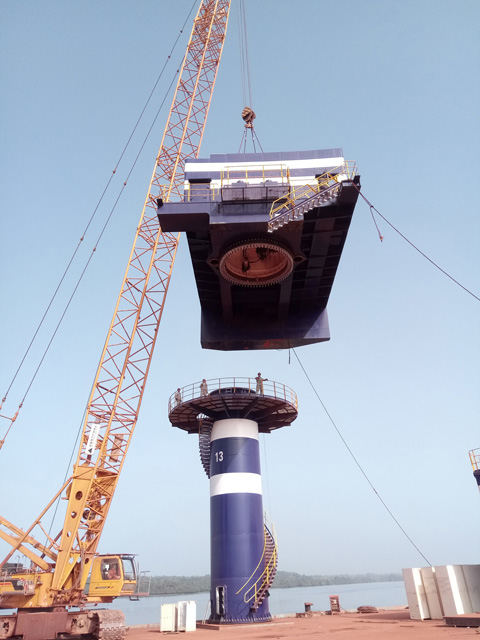 幾內(nèi)亞當(dāng)?shù)貢r間4月5日上午,M27B項目55噸固定吊的最大、最重結(jié)構(gòu)件——轉(zhuǎn)盤順利吊裝完成。吊裝難點順利渡過,大家懸著的心總算落下了。算起來這是我們海西在非洲大陸上安裝的第13臺固定吊了。