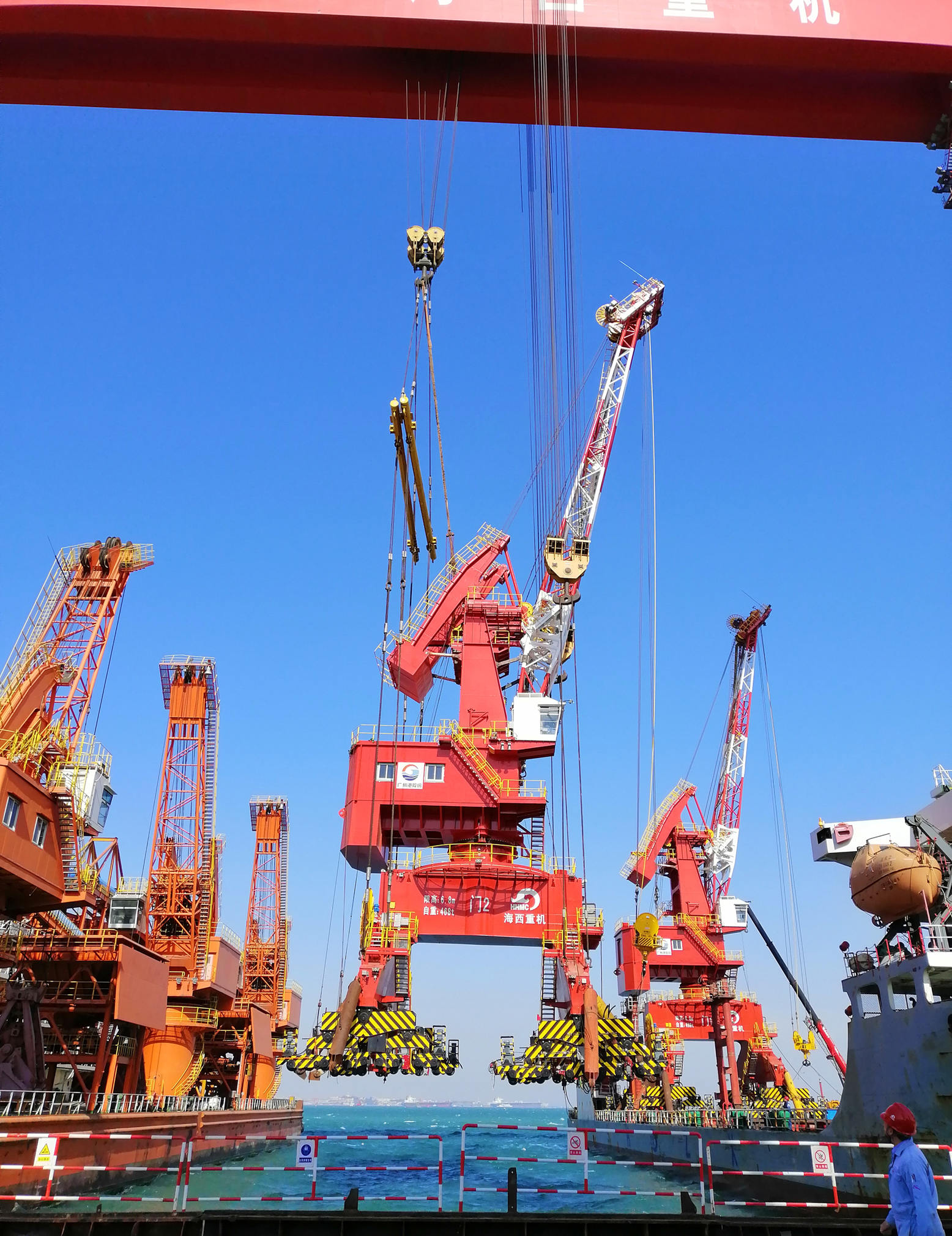 因初次起吊整機上船,船面空間緊湊,在場所有的工作人員都屏住了呼吸,時刻觀察著,現(xiàn)場除了龍門吊運轉(zhuǎn)的轟鳴聲,就只剩下海浪拍打碼頭的聲音在耳邊回響?!耙÷湮怀晒?!”——靜靜地關(guān)注著這一過程的我們在落位成功的那一瞬間,心底無比的振奮,澎湃的心潮久久不息。自14日下午18點開始吊裝前詳細的聯(lián)合檢查,確認無誤后,20點正式起吊,22點落位完成,23點順利摘鉤,經(jīng)過近5個小時的忙碌作戰(zhàn),整機吊裝工作一氣呵成,效率之高著實令人驚嘆。