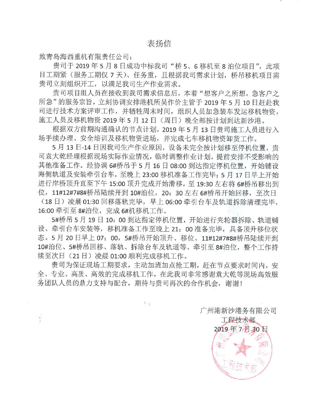 廣州港新沙港務(wù)有限公司發(fā)來了感謝信
