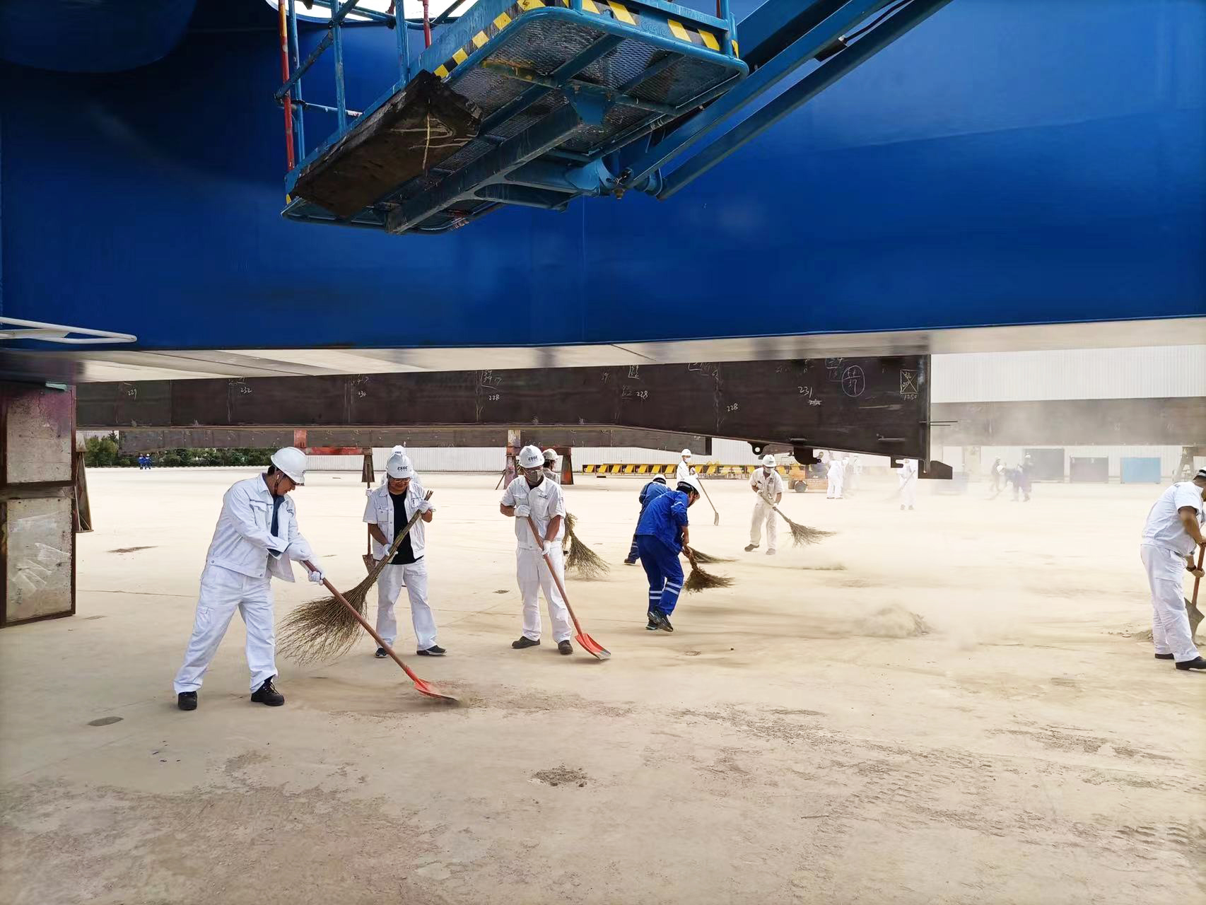 各黨支部根據(jù)劃分好的勞動區(qū)域精心策劃,對支部參與人員進行分組,細化任務(wù)分工,提前領(lǐng)用清潔工具,為活動開展做足準備。每天下午四點,相應(yīng)的黨支部根據(jù)分工安排,帶好清潔工具,分組奔赴新拼裝場地區(qū)域。大家熱情似火,干勁十足。每個參與者不怕苦不怕累,不怕塵土迷了眼睛,用掃帚掃、用鐵鍬鏟,齊心協(xié)力,爭做先鋒。汗水濕透了每個人的衣襟,熱火朝天的勞動場面感染著在場每一個人,工作服蒙上了一層塵土,每個人的臉上卻洋溢著笑容,帶走了泥土,留下了熠熠生輝的奉獻精神。
