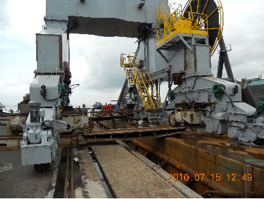 2010年7月15日,我公司為香港聯(lián)合船塢集團(tuán)有限公司(HUD)承制的MQ5050門座起重機到達(dá)香港HUD公司碼頭并安全滾裝上岸。該門機采用臺車輔助、整機滾裝、整體捆扎、拖輪加平板駁船的運輸方式,從青島至香港航次歷時8天。