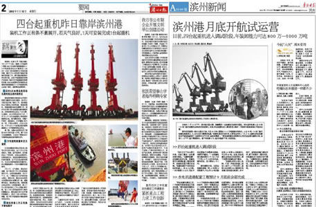 我公司為濱州港務(wù)有限責(zé)任公司承制的4臺(tái)MQ2533門座起重機(jī)于2012年7月10日運(yùn)抵濱州港碼頭后,引起了當(dāng)?shù)卣鐦O大關(guān)注。濱州市委書記、濱州市長(zhǎng)辦公室、濱州市委組織部、濱州市海事局、濱州市公安局、以及各縣區(qū)級(jí)領(lǐng)導(dǎo),先后到碼頭進(jìn)行參觀指導(dǎo),濱州日?qǐng)?bào)、魯北晚報(bào)更是多次到碼頭進(jìn)行采訪報(bào)道。