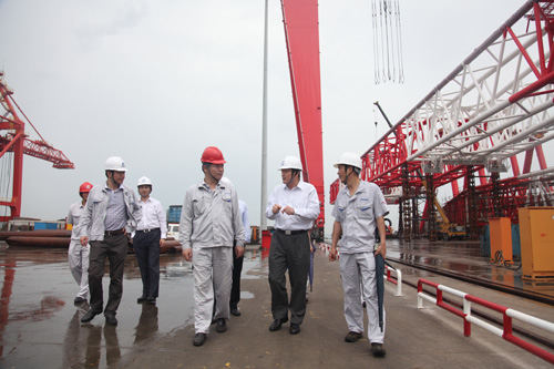 在參觀公司現(xiàn)場(chǎng)建成自用的1600噸龍門吊項(xiàng)目、正在吊裝上船的3600噸全回轉(zhuǎn)浮吊項(xiàng)目、面對(duì)公司的120米突堤碼頭以及繁忙的生產(chǎn)組裝現(xiàn)場(chǎng),董總對(duì)公司的經(jīng)營發(fā)展態(tài)勢(shì)予以充分肯定。他說:在當(dāng)前市場(chǎng)經(jīng)濟(jì)低迷的形勢(shì)下,青島海西重機(jī)能夠抓住發(fā)展機(jī)遇,逆勢(shì)而上,尤其在技術(shù)創(chuàng)新和產(chǎn)品開發(fā)方面發(fā)揮了自身潛能,具有前瞻性和市場(chǎng)眼光,更是武漢船機(jī)公司在船市低迷的情況下,產(chǎn)品結(jié)構(gòu)調(diào)整的有力體現(xiàn)。董總特別對(duì)近期在煙臺(tái)、連云港、海南洋浦等港口項(xiàng)目投標(biāo)中,我司與上海振華同臺(tái)競(jìng)標(biāo)并連續(xù)奪得標(biāo)的給予了高度肯定。