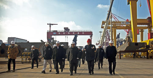 許克振一行實(shí)地考察了海西重機(jī)生產(chǎn)現(xiàn)場(chǎng)及組裝發(fā)運(yùn)現(xiàn)場(chǎng),參觀了包括韓國(guó)批量岸橋、自動(dòng)化軌道吊等在內(nèi)的港口機(jī)械設(shè)備及在制的批量自升式海工平臺(tái)項(xiàng)目,看望慰問(wèn)了生產(chǎn)一線干部職工,并在隨后召開的中船重工青島海西灣基地相關(guān)企業(yè)負(fù)責(zé)人座談會(huì)上,聽取了海西重機(jī)董事長(zhǎng)孫總關(guān)于企業(yè)產(chǎn)品結(jié)構(gòu)、技術(shù)創(chuàng)新、生產(chǎn)經(jīng)營(yíng)及中長(zhǎng)期發(fā)展規(guī)劃等方面的情況匯報(bào)。